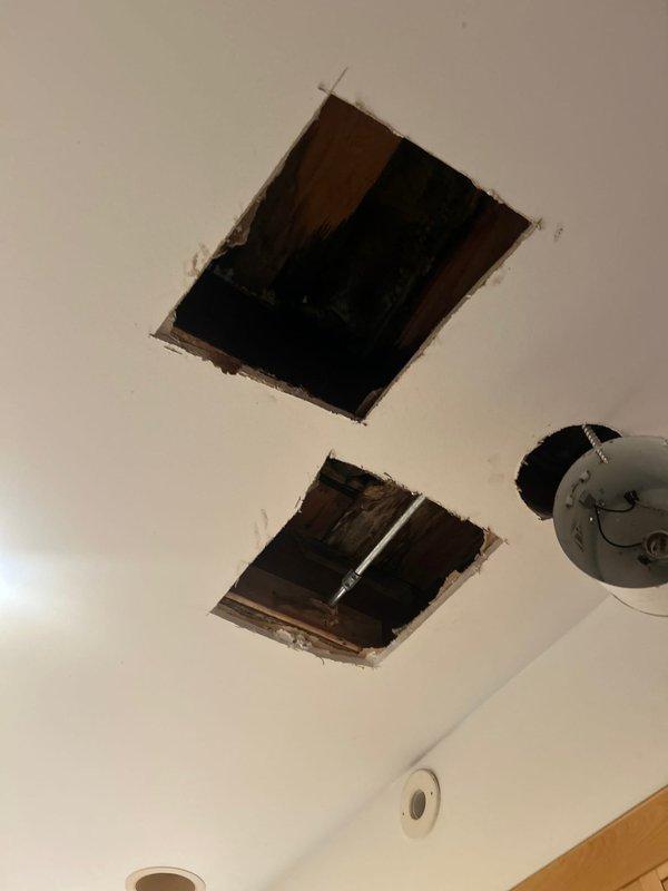 Performed inspection for reported water leak in ceiling. Located and accessed affected area by creating two inspection openings in ceiling drywall. Visual examination revealed moisture intrusion from above, with structural elements visible through access points. Further investigation required to pinpoint exact source of leak.