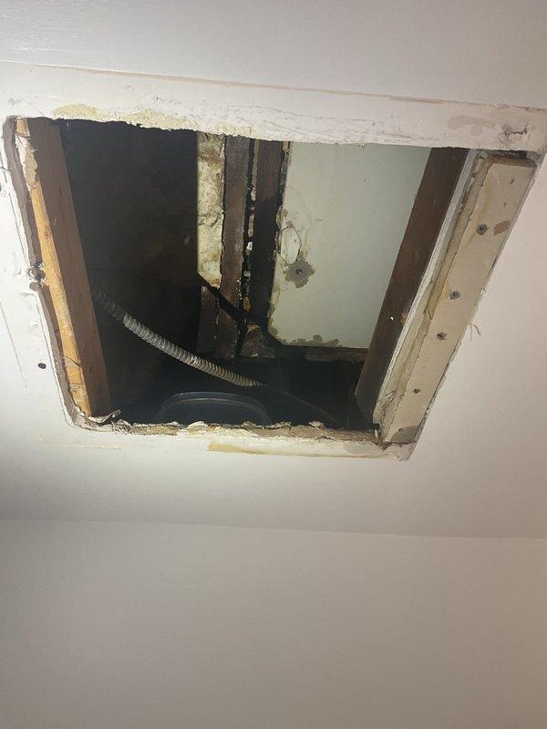 Inspected reported leak from upstairs toilet through ceiling below. Observed water damage and deterioration around ceiling access panel, with visible discoloration and potential mold in the cavity. Confirmed wax ring failure despite previous replacements; recommended complete toilet flange replacement rather than another temporary wax ring solution.
