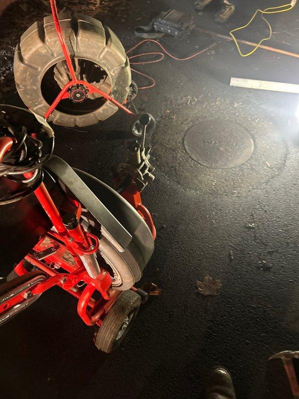 Conducted commercial drain and sewer assessment utilizing specialized mechanical drain cleaning equipment with snake/cable system. Deployed professional-grade pipe inspection tools to evaluate drainage system condition and identify potential issues in the dark workspace. Equipment setup included primary cleaning machine with drum mechanism and auxiliary components for comprehensive diagnostic evaluation.