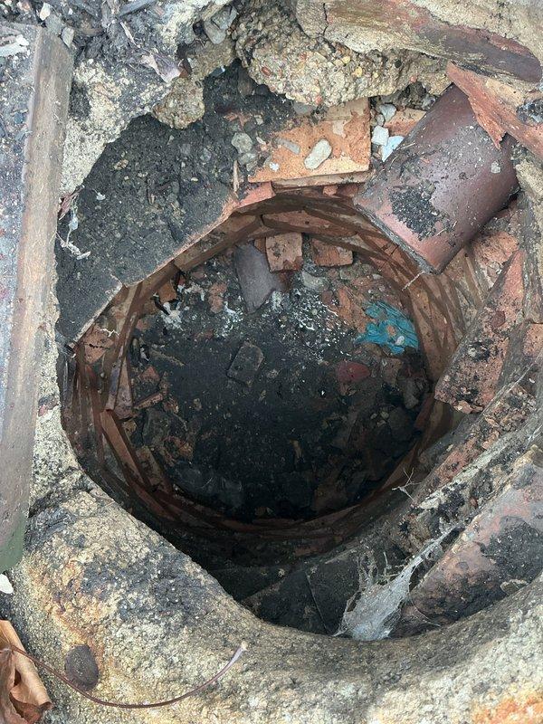 Conducted site inspection of deteriorated catch basin as requested by customer. Observed significant structural failure with complete cave-in of the basin structure. Documented extensive corrosion and rust damage to the metal collar, with surrounding concrete showing severe fragmentation and deterioration. Photos taken to document current condition for proper repair estimation.