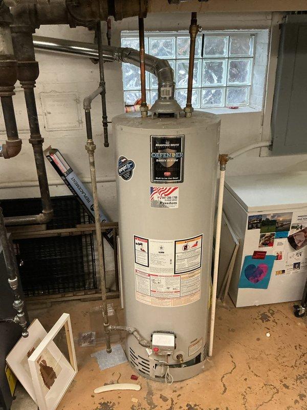 Conducted assessment of customer's aging water heater in basement utility room. Unit appears functional but customer requested replacement due to age concerns. Current installation includes standard tank-style water heater with copper supply lines and metal vent piping. Provided estimate for complete replacement with comparable new unit, including necessary plumbing modifications and proper disposal of existing equipment.