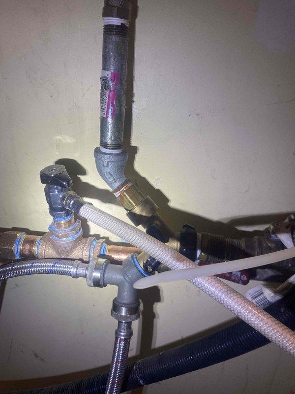 Responded to service call for leaking washing machine supply line. Upon inspection, discovered aged and corroded metal pipe connections with visible water damage on adjacent wall. Replaced the deteriorated supply hoses with new braided metal lines, properly secured all fittings, and tested system to confirm complete resolution of leak.